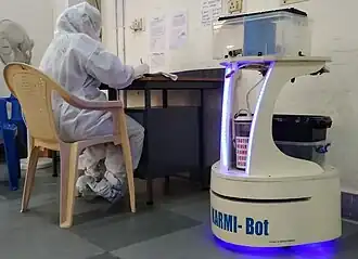 The robot named ‘KARMI-Bot’ is used to assist patients at the medical college's COVID-19 isolation ward. The robot developed by ASIMOV Robotics, was donated to medical college by famous actor Mohanlal. The robot has fully autonomous features for dispensing food & water, disinfection, collecting trash and other features like video call. [5]