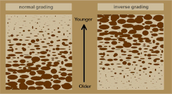 In reverse grading or inverse grading the bed coarsens upwards. This type of grading is relatively uncommon but is characteristic of sediments deposited by grain flow and debris flow.[2] A favored explanation for reverse grading in these processes is kinetic sieving.[3] It is also observed in aeolian processes, such as in pyroclastic fall deposits.[4] These deposition processes are examples of granular convection.