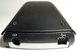 Typical ports on a graphing calculator. These contain a 2.5 mm I/O port for connecting to other calculators and a Mini USB port for connecting to a PC.