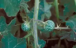 The plant is a noxious weed producing large, dense, prickly thickets that outcompete native plants and disturb wildlife habitat.[1] It reduces the cattle carrying capacity of pasture land, costing ranchers millions of dollars in Florida alone. It is an alternate host for several viruses of crop plants, including cucumber mosaic virus, potato leafroll virus, potato virus Y, tobacco etch virus, and tomato mosaic virus. It hosts pest insects such as the silverleaf whitefly, Colorado potato beetle, tomato hornworm, tobacco hornworm, and southern green stinkbug.[3]