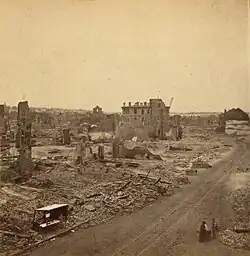 The Great fire of Portland, Maine, sometimes known as the 1866 great fire of Portland, occurred on July 4, 1866—the second Independence Day after the end of the American Civil War. Five years before the Great Chicago Fire, this was the greatest fire yet seen in an American city. It started in a boat house near today's Hobson's Wharf on Commercial Street, likely caused by a firecracker or a cigar ash.[1] The fire spread to a lumber yard and on to a sugar house, then spread across the city, eventually burning out early the next morning on Munjoy Hill in the city's east end.[1][2]