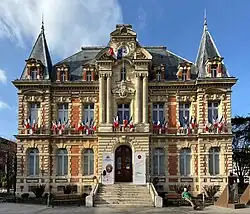 From the French Revolution to the mid-19th century, the town council rented premises for its meetings. In 1866, the town council decided to commission a dedicated town hall. The site they selected was occupied by two private houses, Nos. 6 and 8 on Rue de l'Empereur (now Rue Paul Vaillant-Couturier).[1] The foundation stone for the new building was laid by the mayor, Adrien Cramail, on 24 May 1868. It was designed by Lebois & Prince in the Second Empire style, built in red brick and ashlar stone and was officially opened on 7 November 1869. Napoleon III commemorated the occasion by the grant of a coat of arms to the town.[2][3][4]