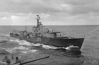 Algonquin was modernized to a Type 15 frigate at Esquimalt and recommissioned on 25 February 1953 with the hull number 224. She was not selected for duty in the Korean War and was instead posted to CFB Halifax on the North Atlantic coast where she spent much of the next 14 years working with Canada's NATO allies.[5] The First Canadian Escort Squadron came into being on 10 November 1953 as part of Atlantic Command with Algonquin as its flagship. The squadron was initially composed of Algonquin and the Prestonian-class frigates Lauzon, Prestonian and Toronto.[33] In September the First Canadian Escort Squadron took part in the NATO naval exercise "New Broom II" and in October "Morning Mist" before performing a two-month training cruise in the Mediterranean Sea, making several port visits.[34][35] The squadron returned to Canada on 10 December 1954.[35] In January 1958, Algonquin collided with HMCS Nootka while operating in the Atlantic with the First Canadian Escort Squadron.[36]