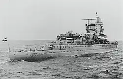 HNLMS De Ruyter was a unique light cruiser of the Royal Netherlands Navy. Intended to reinforce the older Java-class cruisers in the Dutch East Indies, her design and construction were limited by the Great Depression. Laid down in 1933 and commissioned in 1936, she spent the first part of her career patrolling nearby waters prior to the Dutch declaration of war on Japan. During the Dutch East Indies campaign, she became the flagship of the American-British-Dutch-Australian Command Combined Strike Fleet. For the first several months of war, she led Allied warships in unsuccessful attempts to intercept Japanese invasions and withstood multiple air attacks. During the Battle of the Java Sea, the cruiser was ambushed by a night-time torpedo attack by Haguro and sunk with most of her crew. Her wreck was later illegally salvaged for metal in the 2010s, which destroyed most of the ship.