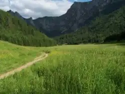 Wielka Polana ranks among the Tatras' most fertile clearings, formed on a former glacial lake bed filled with several alluvial fans, with sediment depths up to 65 meters (213 feet). Both Wielka and Mała Polana were mowed, with hay transported in winter by sled.[1] Grazing occurred on surrounding slopes, gullies, scrublands, forests, and upper valley tiers – Niżnia Świstówka and Wyżnia Świstówka. Pasture areas were used communally, while the two clearings were cadastrally and legally divided, with owners' shares dictating livestock quotas.[5]