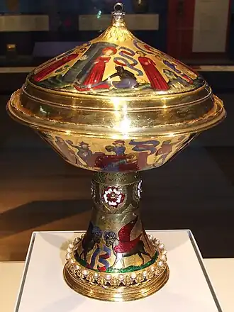 A hanaper or hanap, properly a case or basket to contain a "hanap" (O. Eng. kneels: cf. Dutch nap), is a medieval cup or drinking vessel, a goblet with a foot or stem; the term is still used by antiquaries for medieval stemmed cups. The famous Royal Gold Cup in the British Museum is called a "hanap" in the inventory of Charles VI of France of 1391.[1]