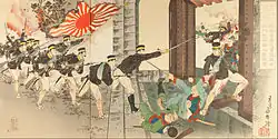 The Japanese force tasked with assaulting the gate found itself outnumbered and immobilized by Chinese suppression fire. Jūkichi was selected as one of a 13-member forlorn hope charged with climbing the walls. Once inside, Jūkichi and his team were engaged by numerous Chinese warriors. Fending them off, Jūkichi himself opened the Hyeonmu Gate and thereby admitted the Japanese into the city. Pyongyang quickly fell as the Chinese forces within the city routed.[1][2]