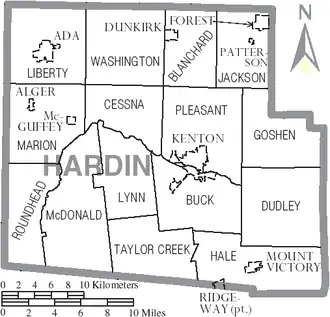 Hardin County is a county located in the west central portion of the U.S. state of Ohio. As of the 2020 census, the population was 30,696.[2] Its county seat and largest city is Kenton.[3] The county was created in 1820 and later organized in 1833.[4] It is named for John Hardin, an officer in the American Revolution.[5]
