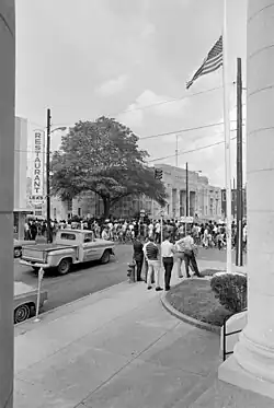 January 22, 1964, was "Freedom Day" in Hattiesburg, a major voter registration effort supported by student demonstrators and 50 northern clergymen. For the first time since Reconstruction, an inter-racial protest successfully picketed the courthouse for voting rights without being arrested. Roughly 100 African Americans attempted to register, though only a few were allowed into the courthouse. Fewer still succeeded in gaining entry on the rolls.[21] Each day thereafter for many months, activists resumed the courthouse protest in what became known as the "Perpetual Picket."[22]