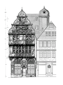 Above the ground floor there were two cantilevering half-timber framed floors, their gable side facing the market with two gable floors above. However, in comparison to the first floor the second floor protruded only on the side facing the market. The eastern side, facing the cathedral, displayed a very delicate design of the timber framing, which formed a pattern of saltires. The timber framing could be compared to the design at Schwarzer Stern, which had been built at Römerberg shortly before. In contrast to the Goldene Waage the Schwarzer Stern was rebuilt in the 1980s after its destruction in World War II. The timber frame of the upper floors also showed almost continuous rows of narrow windows on all sides. On the first floor there were eleven windows to the eastern side, six to the northern. On the second floor there were twelve windows to the eastern and four to the northern side. The glazing was completed around 1750.[5]