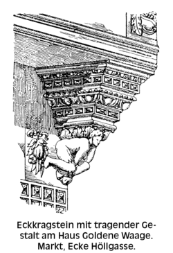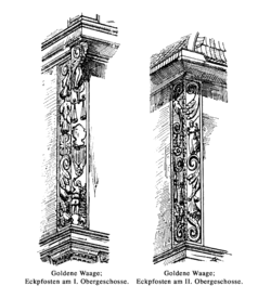 Taking early seventeenth century conditions into account, the construction was a masterpiece of structural engineering of both the material and the construction: the open-worked arcades on the ground floor were not suitable as load-bearing elements. However, this was intentional, as it provided plenty of room on the ground floor to display the goods on sale. Thus, the Goldene Waage was essentially a house built upon pillars, but only the reinforced pillar at the north-eastern edge could be seen from outside. The remaining seven pillars on the ground floor provided structural analysis of the building and were located between the arcades. However, the pillars were so well incorporated into the arcades they seemed rather to be decorative elements. The corbels, which were located below the impost block of the shaft, had been carefully designed by the stonemason: on the biggest corbel at the north-western corner a crouching man surrounded by flowers was depicted (as can be seen in the image), the remaining seven corbels alternated between the depiction of a man's and a woman's head (as can be seen in the image). Only the stone on the outermost (most western from the top) side facing the market was particularly special in its own right, depicting a ram's head – whether this could be seen as a reference to the name Hamel (similar to Hammel, German for ram), has never been resolved. The name of the stonemason also remains unknown.