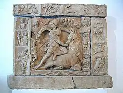Numerous dedications and religious monuments from Roman times have been found in Heidelberg, which prove that alongside Roman gods such as Jupiter, Minerva, Neptune, Fortuna, Hercules, and Vulcanus, oriental deities such as Mithras and the Celtic-Germanic gods Cimbrianus and Visucius were also worshipped.[26] Evidence of the blending of Roman religion with indigenous beliefs can also be seen in several Jupiter Columns found in Heidelberg. These pillar-mounted depictions of Jupiter riding down a giant were typical of the north-western provinces. They usually belonged to smaller sanctuaries or stood in busy places with important traffic connections.[27]