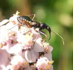 Members of the families Reduviidae, Phymatidae and Nabidae are obligate predators. Some predatory species are used in biological pest control; these include various nabids,[84] and even some members of families that are primarily phytophagous, such as the genus Geocoris in the family Lygaeidae.[85] Other hemipterans are omnivores, alternating between a plant-based and an animal-based diet. For example, Dicyphus hesperus is used to control whitefly on tomatoes but also sucks sap, and if deprived of plant tissues will die even if in the presence of whiteflies.[86]