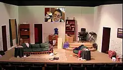 There are more than 30 sound and video clips which must be recorded in advance and played on cue. Alternatively some can be live feeds from backstage, or recorded during the performance and replayed.