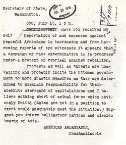 A telegram written by Morgenthau to the State Department in 1915 described the massacres of Armenians in the Ottoman Empire as a "campaign of race extermination."