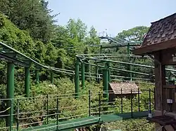 The coaster initially goes up a lift hill, then falls slightly to the left. It then falls down another time, goes right, then left and right again and returns to its station.[6] The coaster has two trains with ten cars per train, with two riders across per row, and thus can have 20 riders per each run.[5] Herky and Timmy's Racing Coaster's tracks are 1030.2 ft long and made of steel, and the ride runs for 1.02 min.[5] The coaster is themed after The Tortoise and the Hare, an Aesop fable,[5] due to its location in Aesop's Village.[4] The ride initially went forwards, but starting from December 2019 to February 2020, the rollercoaster went backwards as part of Everland's New Year's Day event.[7] Herky and Timmy's Racing Coaster was the first roller coaster in South Korea to go backwards.[7] The rollercoaster currently continues to go backwards after the New Year's Day event.[8]