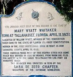 Whitaker - William Whitaker was the first documented pioneer of European descent to settle permanently in what became the village of Sarasota.[19] After time spent along the Manatee River at the village of Manatee, Whitaker built upon Yellow Bluffs, just north of present-day Eleventh Street. He sold dried fish and roe to Cuban traders working the coast and in 1847, he began a cattle business.