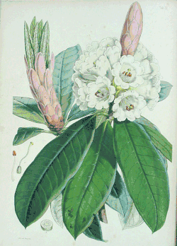 Hooker and a sizeable party of local assistants departed for eastern Nepal on 27 October 1848. They travelled to Zongri, west over the spurs of Kangchenjunga, and north west along Nepal's passes into Tibet. In April 1849 he planned a longer expedition into Sikkim. Leaving on 3 May, he travelled north west up the Lachen Valley to the Kongra Lama Pass and then to the Lachoong Pass. Campbell and Hooker were imprisoned by the Dewan of Sikkim as they travelled towards the Cho La in Tibet.[25][26] A British team was sent to negotiate with the king of Sikkim. However, they were released without any bloodshed and Hooker returned to Darjeeling, where he spent January and February 1850 writing his journals, replacing specimens lost during his detention and planning a journey for his last year in India. According to an 1887 journal written by Indian administrator Richard Temple, many of the rhododendrons found in English gardens of the time were grown from seeds collected by Hooker in Sikkim.[27]