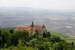 The most important architectural monument is the Jezeří Castle incorporated into the slopes of the Ore Mountains. It was originally a Gothic castle from the 14th century, later rebuilt in the Renaissance and then in the Baroque style. Most of its English-style park was destroyed by coal mining.[3] Since 2023, it has been protected as a national cultural monument.[8]