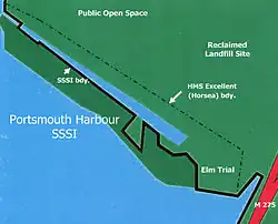 However, in 2013 the south-eastern corner was acquired by Portsmouth City Council for housing development.[1] Most of the area to the south-west of the lake is part of the Portsmouth Harbour Site of Special Scientific Interest (SSSI), the remainder was declared a Site of Importance for Nature Conservation (SINC) in 2011.