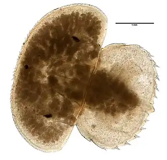 The opisthosoma or abdomen of a horseshoe crab is composed of several fused segments.[25]: 556 Similar to a trilobite, the abdomen is made up of three lobes: a medial lobe in the middle, and a pleural lobe on either side.[27] Attached to the perimeter of each pleural lobe is a flat, serrated structure known as the flange. The flange on either side is connected by the telson embayment, which itself is attached to the medial lobe.[27] Along the line where these lobes meet are six sets of indentations known as apodeme. Each of these serves as a muscle attachment point for the animal's twelve movable spines.[27]