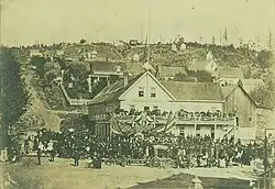 Before the Seattle Hotel rose in 1890, there was the Occidental Hotel.[1] The first Occidental, which opened in 1861, was a wooden building. Twenty years later, on September 26, 1881, it held a memorial service for President James Garfield, who had died five days earlier from injuries sustained when he was shot in July.