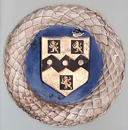 Arms of Rolle: Or, on a fesse dancetté between three billets azure each charged with a lion rampant of the first three bezants