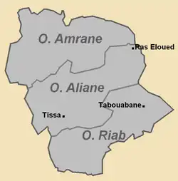 And the Ouled Riab at south, divided in : Awlad Yahya : al-Shaashaa, al-Gharaba, Awlad Alid, and Awlad Bnikhal : al-Ghual, Awlad Hilal, al-Habarja, Bani Satitine, Awlad Abd al-Karim, al-Shababat, and Bani Khalifa