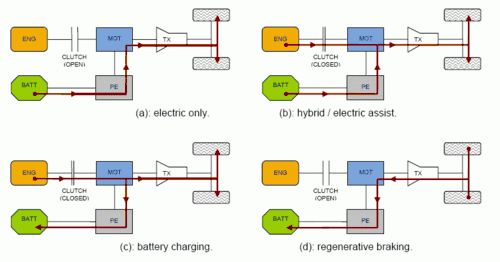 Hybrid vehicles can be used in different modes. The figure shows some typical modes for a parallel hybrid configuration.