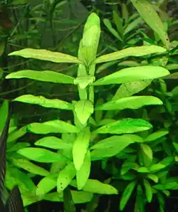 A number of Hygrophila species and cultivars are popular within the aquascaping and aquarium hobbies, including H. angustifolia, H. corymbosa, H. lancea 'Araguaia',[8] H. pinnatifida, H. difformis 'Water Wisteria', H. odora, H. polysperma 'Indian swampweed' and H. siamensis. Additionally, there are some striking newer forms on the market, such as the vivid hybrids of Hygrophila polysperma, 'Sunset'[9] and 'Rosanervig'.[10]