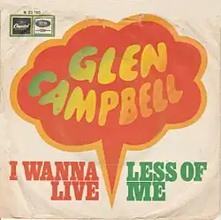 "I Wanna Live" is a song written by John D. Loudermilk and recorded by American country music singer Glen Campbell. It was released in March 1968 as the lead single from the album, Hey Little One. The song was Campbell's sixth release on the country charts and his first of five number ones on the country chart. The song spent three non-consecutive weeks at number one and a total of fifteen weeks on the country charts.[1] The song was also Glen Campbell's third Top 40 release peaking at number thirty-six.[2]