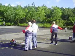 Bavarian curling or Icestock sport (from the German: "Eisstocksport", sometimes separated in English, i.e., "Ice stock sport") is a winter sport, somewhat similar to curling.[1] In German, it is more commonly known as Eisstockschießen or simply Stockschießen among many other names. Although the sport is traditionally played on an ice surface, events are also held on tarmac in the summer. In such a case, it is often simply referred to as Stocksport.[2]