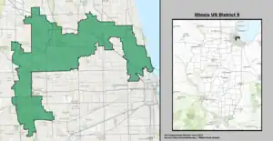 Outside of the Chicago city limits, this district takes in the Cook County communities of Inverness, Harwood Heights, Norridge, and Barrington (shared with Lake County; most of Arlington Heights, Barrington Hills, and Park Ridge; half of Des Plaines, Palatine, Mount Prospect, and Schiller Park; and part of Rosemont, Skokie, Niles, Glenview, Rolling Meadows, Prospect Heights, Buffalo Grove, Schaumburg (shared with DuPage County), Hoffman Estates, and South Barrington.