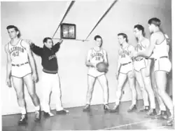 Champaign High School basketball coach Harry Combes was hired to succeed Doug Mills as Mills left the position to focus on his duties as the athletic director. Through his first five seasons as head coach, Combes led the Fighting Illini to three NCAA Final Four appearances in 1949, 1951, and 1952.[2] During his tenure as coach, Combes increased the Fighting Illini's offensive output by changing their style of play. Combes implemented Full-court press defense, causing turnovers at a high rate which translated into Fast break points.[2]