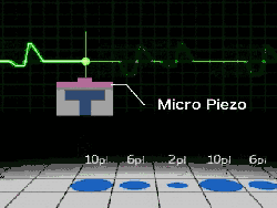 A Howtek inkjet nozzle uses a tubular thin wall piezo that produces a sound wave in the fluid chamber reflecting off both ends of the nozzle. The leading edge of a square wave signal triggers it and the lagging edge of the square wave signal in coincidence with the pressure wave expels the drop. This DOD single jet is acoustic. The 120C Tefzel nozzle is not rigid and does not squeeze. Drop formation is controlled by the fluid properties and nozzle geometry. Drive pulse amplitude and timing play a major role in drop volume and formation. Generally, DOD technology can be very complicated to understand and use.
