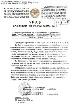 After Bessarabia was again incorporated in the Soviet Union as the Moldavian SSR, the Inochentists gathered their ranks and established a new center in the city of Bălți.[30] They were accused by the Soviet authorities of sabotaging the state plan for agricultural deliveries and resisting the collectivization of agriculture by withholding grain from the authorities. This was, however, a thing common to the Moldavian peasants of all religions.[8] In a memorandum dated October 17, 1946, B. Kozachenko, the Vice-minister of State Security of the Moldavian SSR, reported that virtually every village in four districts of Bessarabia (Bălți, Soroca, Orhei and Chișinău) each had a group of Inochentists, and that their priests were among the "most reactionary and backward".[11] This memorandum resulted in a repression of the Inochentists, which started only a few months later. In January 1947, ten Inochenist leaders were sentenced to terms between six and ten years in the "corrective labor camps".[31]