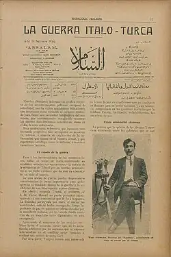 ![]() Clockwise from top left: Battery of Italian 149/23 cannons; Mustafa Kemal with an Ottoman officer and Libyan mujahideen; Italian troops landing in Tripoli; an Italian Blériot aircraft; Ottoman gunboat Bafra sinking at Al Qunfudhah; Ottoman prisoners in Rhodes. | |||||||||