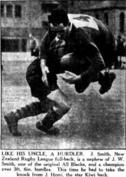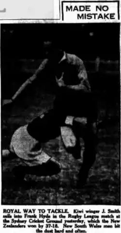 Smith was named at full back in New Zealand’s first team to play against New South Wales on June 11 at the Sydney Cricket Ground.[82][83] The first tour match saw New Zealand lose 25-12 with 28,303 in attendance, though they were unlucky after losing Arthur Kay to injury when they were dominating the game. Smith “played well, but did not live up to his reputation as a goal kicker”. This was due to Jack Hemi being preferred as kicker, and he would go on to kick 32 goals compared to Smith’s five and John Anderson’s three on the tour.[84] Smith did get some attempts at goal in the first half but missed them. During the first half Smith kicked to Frank Johnston, and two passes later the NSW clearing kick was charged down by Harold Tetley with Arthur Kay gathering and scoring.[85] He also drove NSW back with his punting on other occasions. A few minutes into the second half Smith “limped out” with an injury, though he soon came back on.[86] The Truth (Sydney) newspaper wrote that “Smith had a lot to do for a full-back and looked all in at the finish. He has a most pleasing style”.[87] The Courier-Mail noted that “one of the great surprises was the poor kicking of J. Smith, full-back, and J. Hemi, the winger. Both had gained reputations in New Zealand as first rate goal kickers. On Saturday Hemi had several kicks, and Smith had a couple, but they showed poor form”.[88] With Smith’s first attempt he “kicked the ground and only dribbled the ball along. His second attempt was little better. Apparently Smith, only a youth, was nervous, as he was playing in his first big match”.[89] The Labor Daily said that “fullback Smith had a lot to do and was a very tired youth at the finish”.[90] While The Daily Telegraph (Sydney) wrote that he “catches the ball nicely, has a long-range punt, and is a fine tackler”.[91]