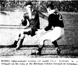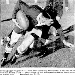 The Queensland wingers Ronald Cooper, and Jack Bates were said to have “more than held their own with Smith and [Ray] Brown”.[109] The Telegraph (Brisbane) said that all the wingers were starved of the ball though “occasionally we saw flashes of brilliance from Kiwi winger Smith, and [Tommy] Chase in the centre. But their opportunities were so rare that it would be difficult to judge their real ability. Smith has plenty of pace, and a good swerve, and had he been given room in which to move he would have made his own openings. But for the most part when he did get the ball he found himself up against a solid defence – solid in both numbers and virility – and he suffered severe punishment”.[110] It was also said that “Smith on the left flank showed pace and nippiness in a couple of scuttling bursts along touch, but was not supported, and the pass inside (generally a perhapser) was not taken”.[111] It was reported by manager Jack Redwood in the New Zealand newspapers that Smith “was troubled with a sore leg” though it was not mentioned when he had picked up this injury with the implication being that it may have occurred in the first match of the tour.[112]