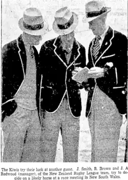 In comments on the New Zealand players the Sydney Morning Herald noted that Smith “is a very fine place kick” and mentioned his relationship with George Smith.[72] The Sun (Sydney) newspaper stated that Smith “will most likely play in the big games [and] should show Australians some brilliant goal kicking”.[73] He was also “fully expected to make good” on the tour in a piece by an Auckland correspondent that appeared in The Telegraph (Brisbane).[74] The Courier-Mail in an article by Pat Frawley noted that Smith was “the lightest man” in the New Zealand squad weighing 10 stone. Though he in fact weighed 10 stone 9 pounds and halfback Wilfred Brimble weighed just 10 stone 3 pounds.[75] While The Labor Daily (Sydney) said that Smith had “advanced steadily this season, as the result of tuition from ex-South Sydney back, Bobby Banham”.[76] An Auckland correspondent in a Sydney Morning Herald article said that Smith “was originally a centre-threequarter, but is ideally suited to the position of custodian”.[77] The Sun said “the find of the season is Jack Smith, who is playing only his second year [of seniors] in the game. He started last year as a five eighth, and is now a full-back. In three matches he kicked 25 goals”.[78]