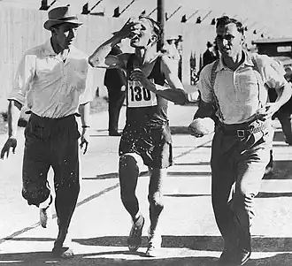 Gibson (center) running marathon at the 1938 British Empire Games