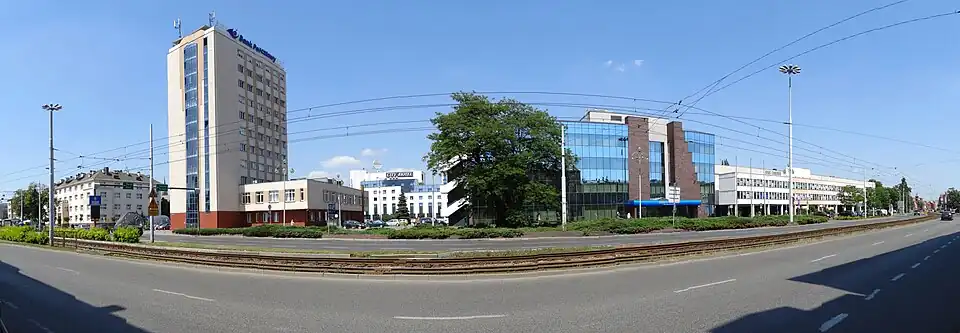 Panorama with Poor Clares' Church (left), Drukarnia mall (center) and part of Regional Office building (right)