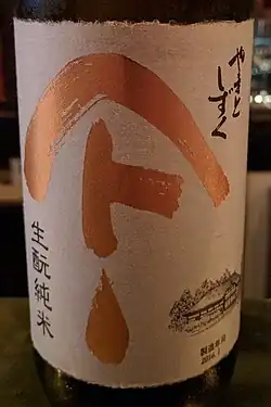 A bottle of Yamato Shizuku (やまと しずく, Japan droplet) sake (name spelt out at top right), with a rebus ∧ト💧︎, which is read as yama (; mountain) (symbolized by the ∧) + to () + shizuku (, droplet) (symbolized by the 💧︎)