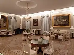 The Jasna Polana mansion was designed by Wallace K. Harrison in a neoclassical style. It has a U-shape with the main building and two wings. The courtyard is enclosed and can be entered through a magnificent portal. The mansion was built in the 1970s at a cost of about $30 million.[2]