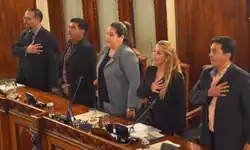 The Senate's directive board—of which the Second Vice Presidency and Second Secretariat correspond to the opposition—was renewed in January 2011. The CN caucus nominated Áñez for the position of second vice president, though her designation failed to receive unanimity and had to be decided by a vote of the opposition legislators.[22] However, when the list of nominees was presented to be voted on by the full Senate, CN Senator Gerald Ortiz broke with the rest of his caucus and presented himself as a candidate for the position of second vice president. The opposition was ultimately unable to find consensus, leading the MAS to decide for it, electing members of both opposing blocs to different posts. Ortiz was designated second vice president while Áñez was elected second secretary, though she refused to assume the post.[23] She blamed the MAS for "endorsing transfuge" and for not abiding by the majority decision of the CN caucus.[24]