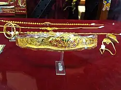 Tamil people have historically been connoisseurs of fine golden jewellery, which has a history predating the Sangam period in the Indian subcontinent.[1][2] Ancient Tamil literature lists out the different types of jewellery worn by women historically from head and every part except the feet.[3] But some traditions have jewellery for feet too. Apart from gold, jewellery was also fashioned out of silver, copper and brass.