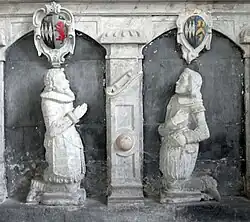 - ^ Above each is an heraldic escutcheon showing arms of Giffard impaling the arms of his respective wife. Above Arthur are shown the arms of Leigh of Burrough, Northam (Argent, a lion rampant gules on a sinister canton azure an escallop or[6] and above John are shown the arms of Wyndham (Azure, a chevron between three lion's heads erased or).