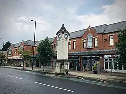 After his death, a 8-metre (26 ft) clock tower was erected in his memory in the forecourt of Didsbury railway station. The Edwardian Baroque Portland stone clock incorporates a pair of drinking fountains and bears a bronze plaque which displays a relief medallion portrait of Rhodes. The inscription reads "In memory of Dr.J.Milson Rhodes JP.CA. 1847-1909. A Friend to Humanity". Although the station was demolished in 1982, the clock still stands as a local landmark and is Grade II listed.[5]