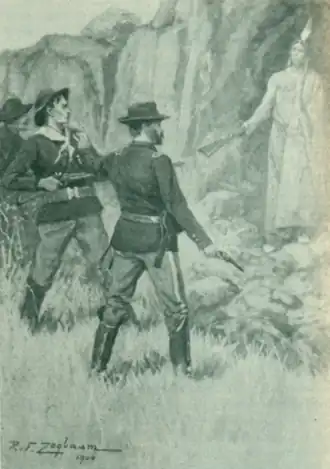 Buffalo Chips was standing opposite me. He was one of those long-haired scouts, and claimed to be a partner of Buffalo Bill's. He thought it was a good place to make name for himself, I suppose, for he told Big Bat that he was going to have one of the Indians' scalps. He had no more than got the words out of his mouth before he yelled, "My God, I am shot." I heard this cry and looked around, Buffalo Chips was falling over into the hole where the Indians were hiding. Bat was looking into the cave where the Indians were, and about five seconds afterwards jumped out with an Indian's scalp in his hand, telling me that he had scalped one of the redskins alive, which I found out to be true. He had seen the Indian that killed Buffalo Chips, and he jumped down onto him as the Indian was reaching to get White's six-shooter. Bat had jumped right down on top of him and scalped him and got out of the cave before anybody knew what he was doing.[66]