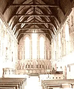 The exterior of the church is notable for its sandstone-block walls, the diapering on the roof formed of light and dark slate, the large wheel window with a central Cross of St Cuthbert on the west front, the large apse with conical roof at the east end, and the tower with its statue of St Cuthbert holding the head of King Oswold and its tympanum featuring Christ in Majesty. Inside, it has a "waggon roof with king-post trusses", and columns of Frosterley marble (or pink granite) in the arcade.[22][25]